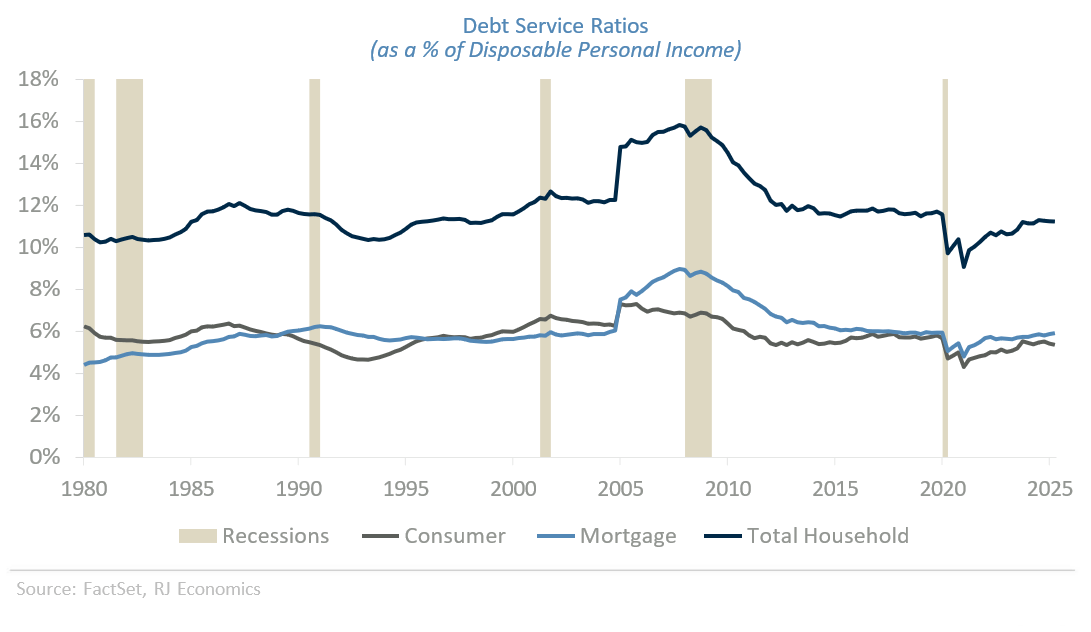 Although the stability of the consumer depends on its ability to generate labor income, i.e., wages and salaries, households’ financial conditions are very important in supporting the stability of consumption. If we look at household debt service payments as a percentage of disposable personal income in the graph below, we see a pattern similar to that during the recovery from the pandemic recession, as this debt service ratio has remained relatively low. Even the large increase in mortgage rates has not been an important source of stress in households’ financial conditions, as borrowing has remained limited.
