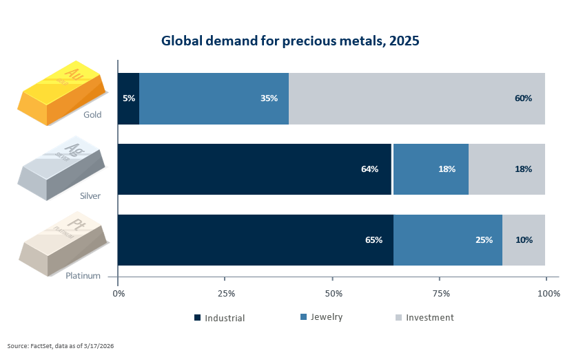 Gold, silver and platinum all posted hefty gains over the past year, but – as with all commodities – they also exhibited intense volatility. Gold is the most sentiment-driven, while silver and platinum tend to be influenced more by “physical” supply/demand fundamentals.